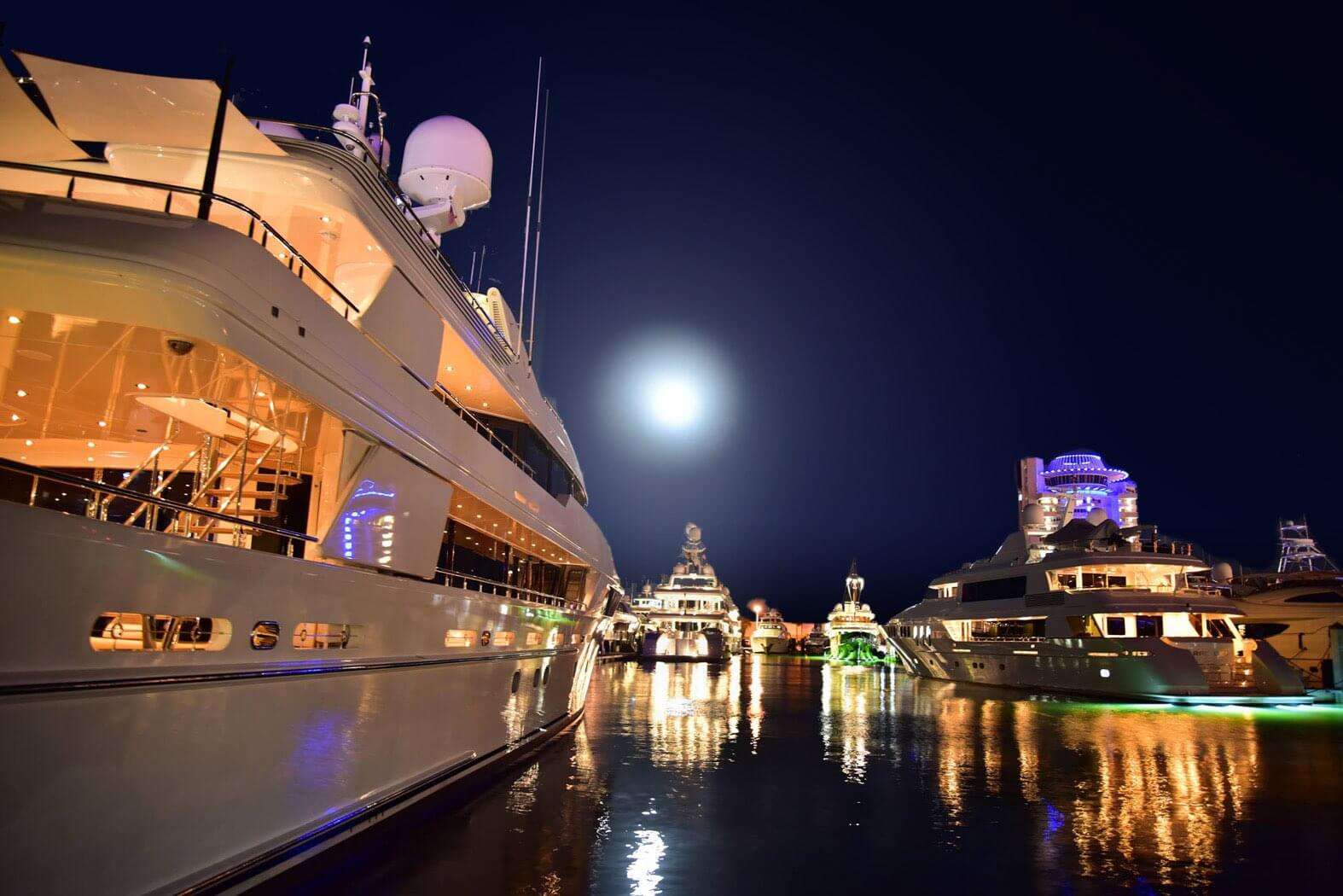 Yacht docked at Pier Sixty-Six Marina in Fort Lauderdale at night